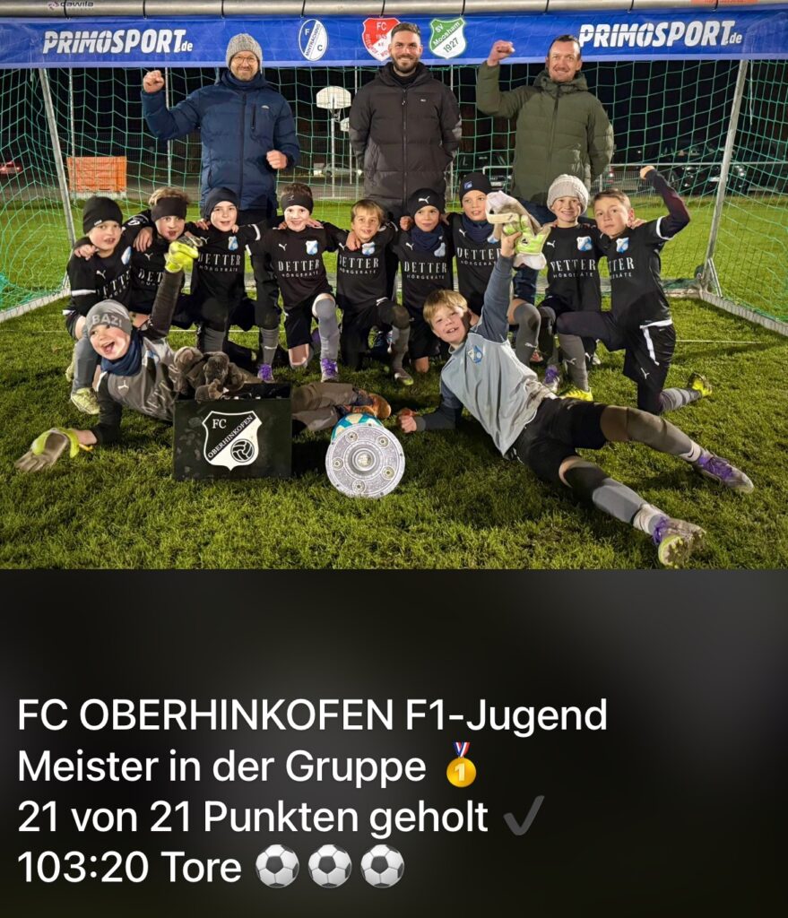F1-Junioren (U9) gewinnen alle Spiele in ihrer Gruppe 31. Oktober 2025Webmaster Die F1-Junioren konnten alle sieben Spiele gewinnen und damit alle 21 Punkte holen. In diesem Jahrgang wird noch ohne Wertung (Tabelle) gespielt.Nichtsdestotrotz konnte mit 103:20 Toren souverän der „Meister“-Titel geholt werden!